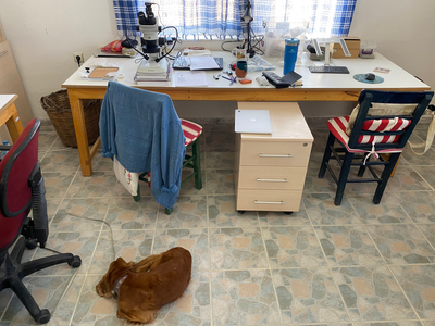 Our workstation at the Asıklı excavation house with Coco waiting for us to finish work so that we can go out and play (left), view of the perforation tube of a broken and reused bead from Balıklı (right)